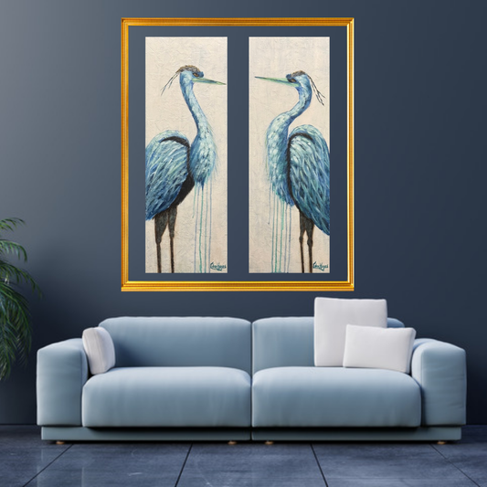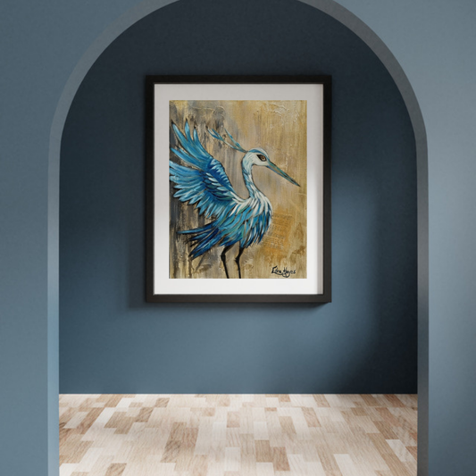 I love the Blue Heron’s beautiful, long beak and what it represents. The Blue Heron’s beak is where their power lies. It is the source of their nourishment and existence. Just like the Blue Heron’s beak, human power lies not so much in a physical part of our body, but in our hope, our faith in something much bigger and greater than ourselves. As you will find gold in the beak of the blue heron and hidden gems of gold throughout my paintings, this gold depicts and is pointing to the hope that we have in looking beyond our circumstances at the gold that lies within them (the good, the value that can come out of our circumstances) if we will look for it. Often, that gold is pointing us to the power that we have through our creator to be over comers, to rise above difficult situations, and always find the good, the value in the situations we face in life. Look for the Gold!