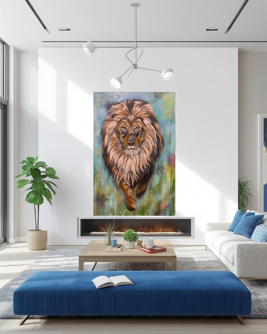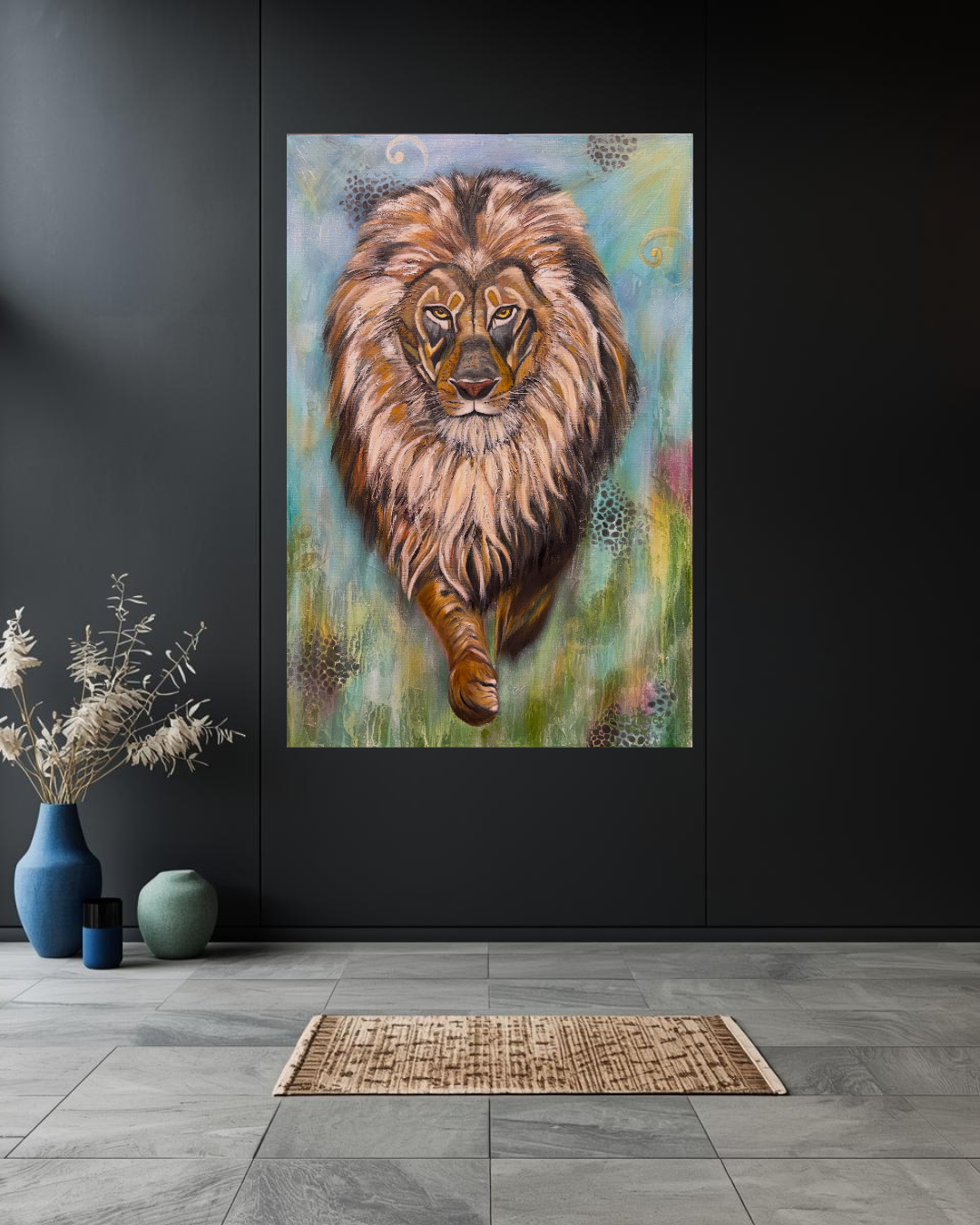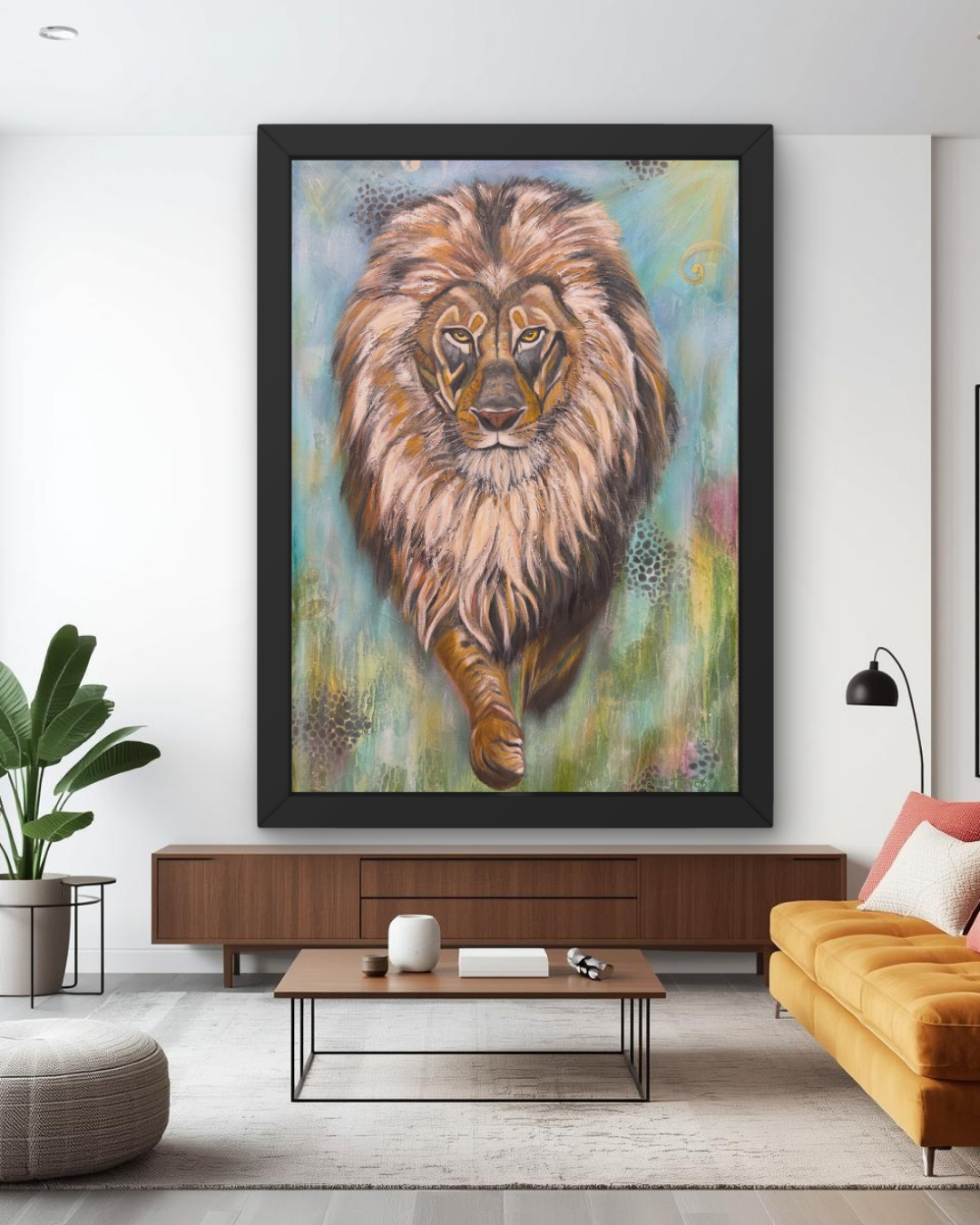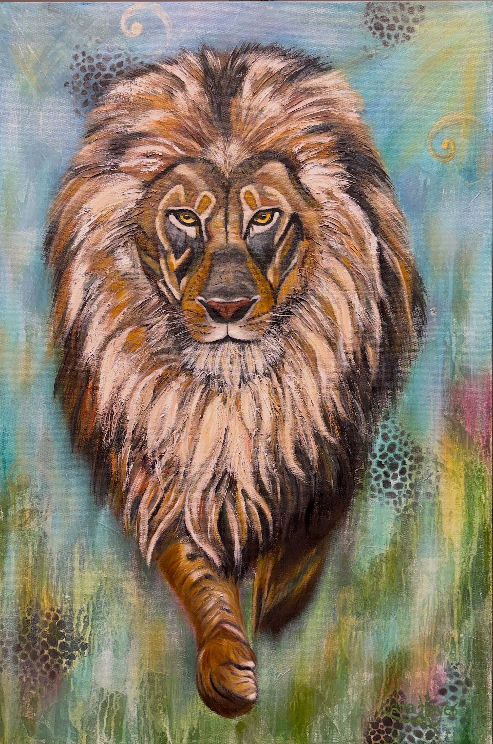 Fine Art Abstract/Realism Animal Painting - Perfect for the person who loves lions and desires a meaningful, colorful piece of original artwork to enhance their interior space. 24x36 Original Oil/Mixed Media on high quality cotton 1.5" gallery wrapped canvas.