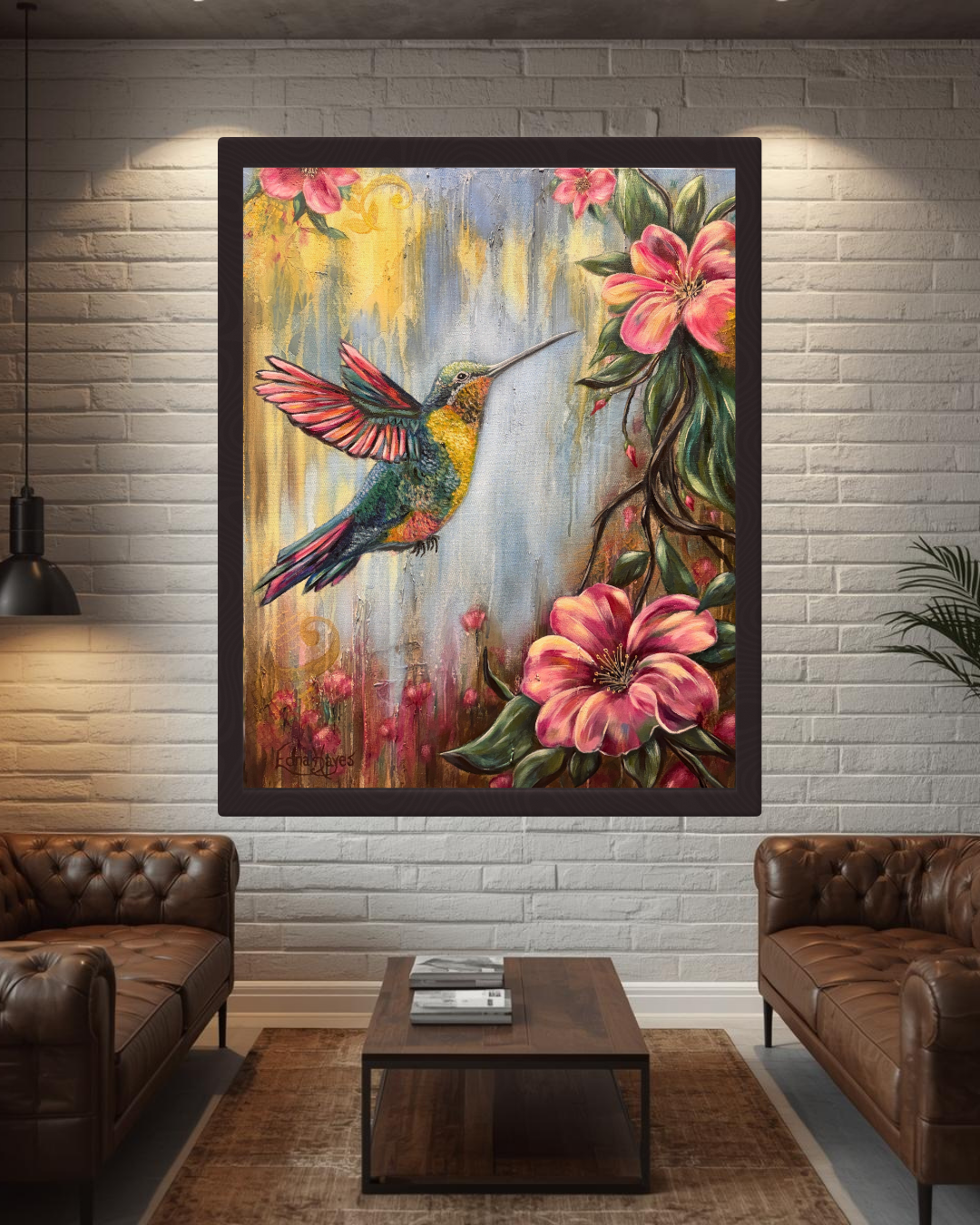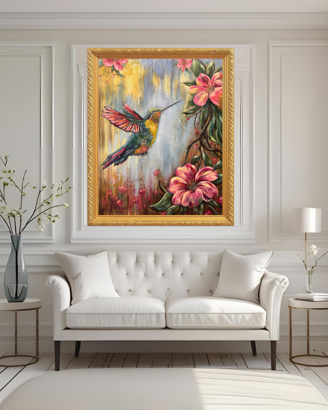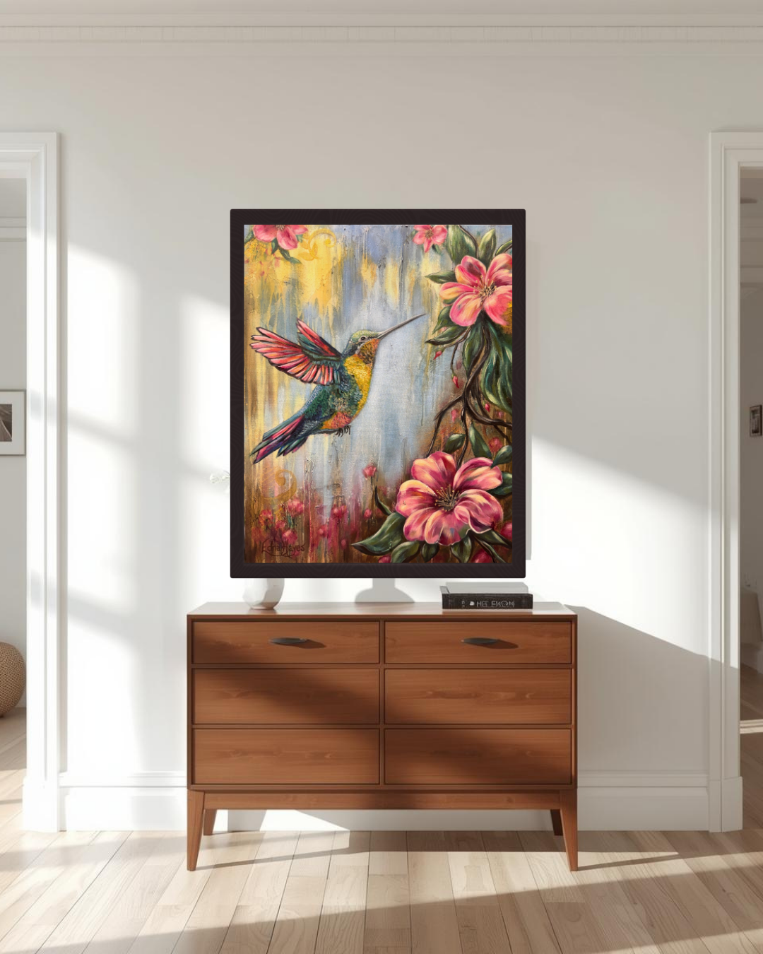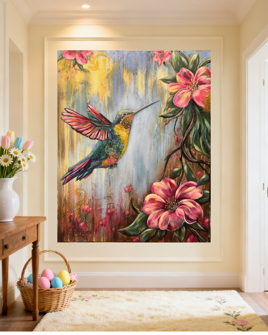 Fine Art Abstract/Realism Humming Bird Painting - Perfect for the person who loves hummingbirds, flowers and desires a meaningful, colorful piece of original artwork to enhance their interior space. 24x30 Original Oil/Mixed Media on high quality cotton 1.5" gallery wrapped canvas.