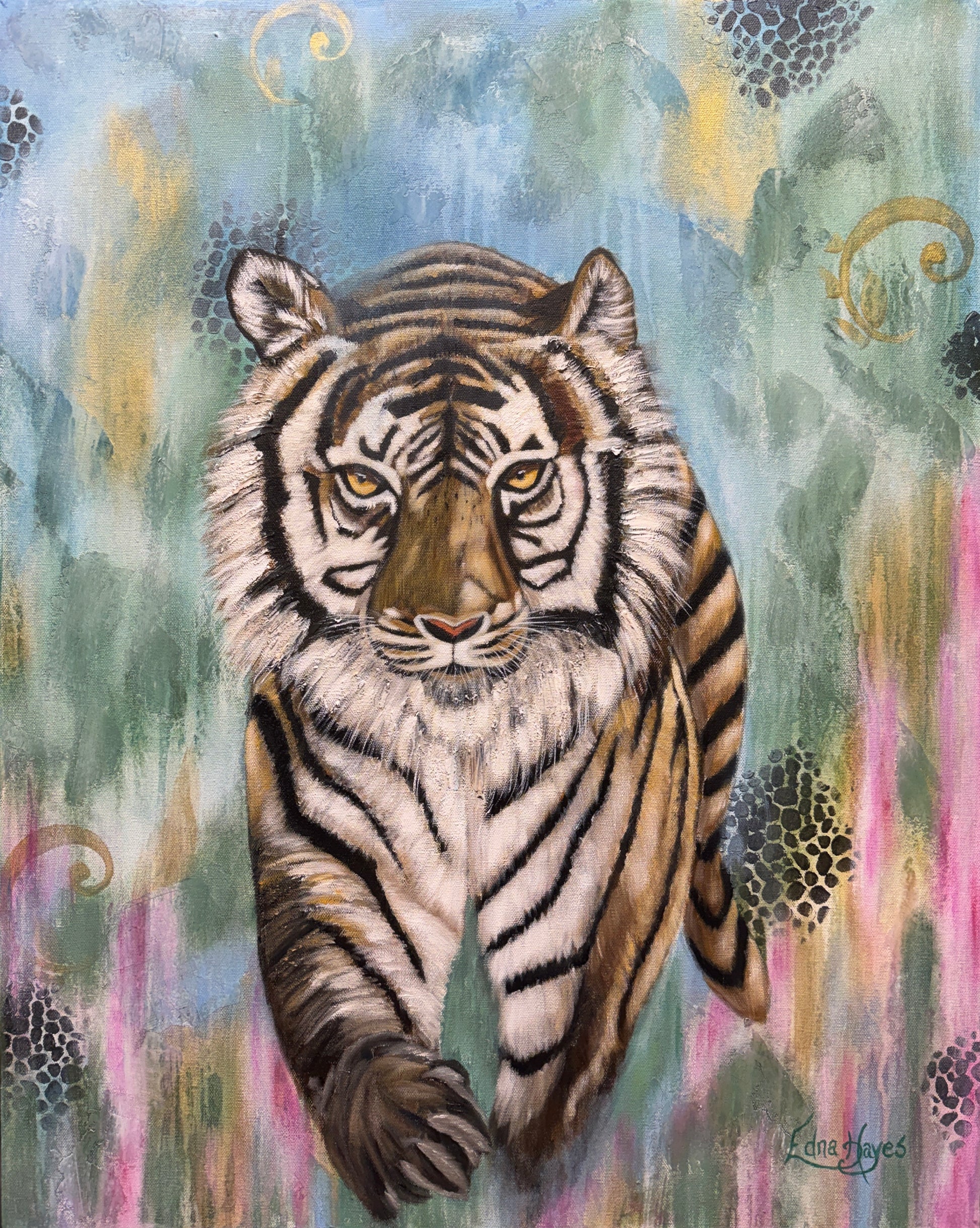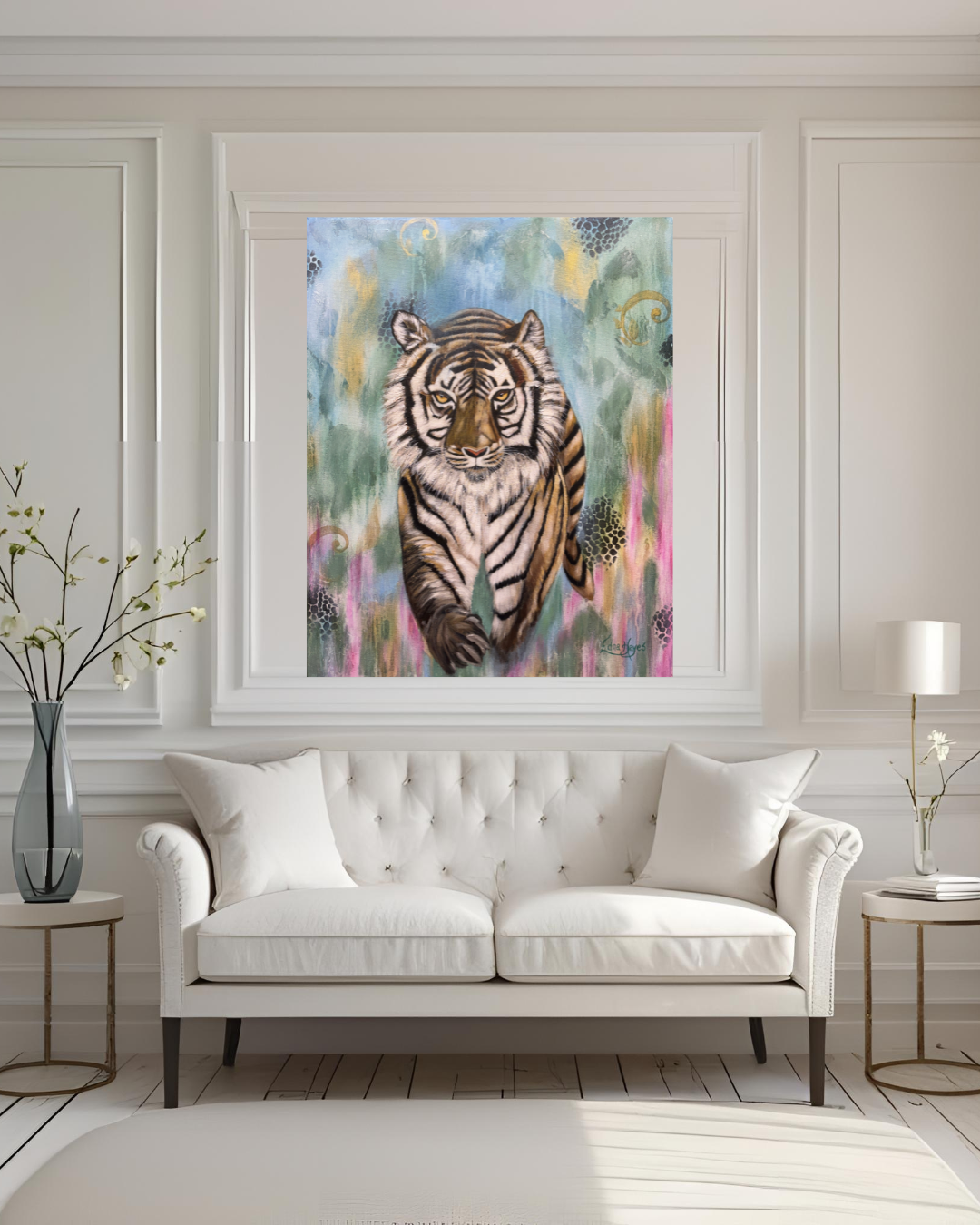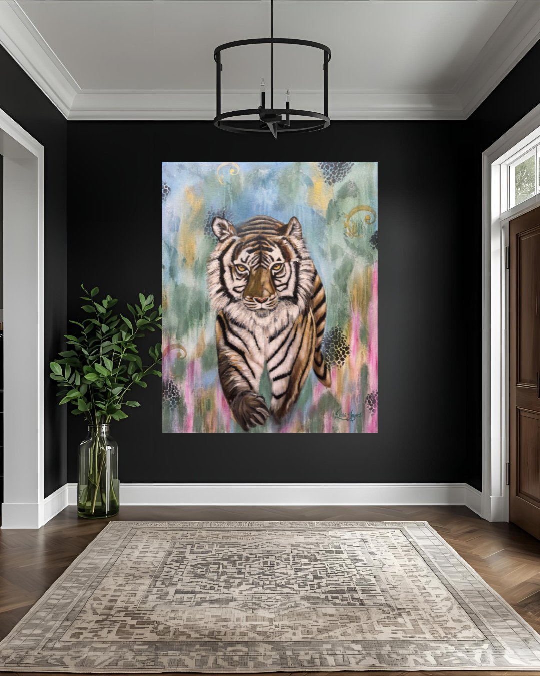 Fine Art Abstract/Realism Animal Painting - Perfect for the person who loves tigers and desires a meaningful, colorful piece of original artwork to enhance their interior space. 24x30 Original Oil/Mixed Media on high quality cotton 1.5" gallery wrapped canvas.