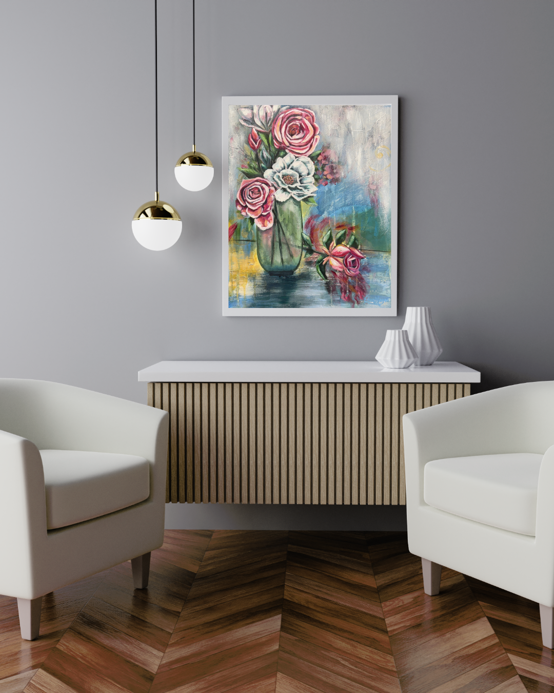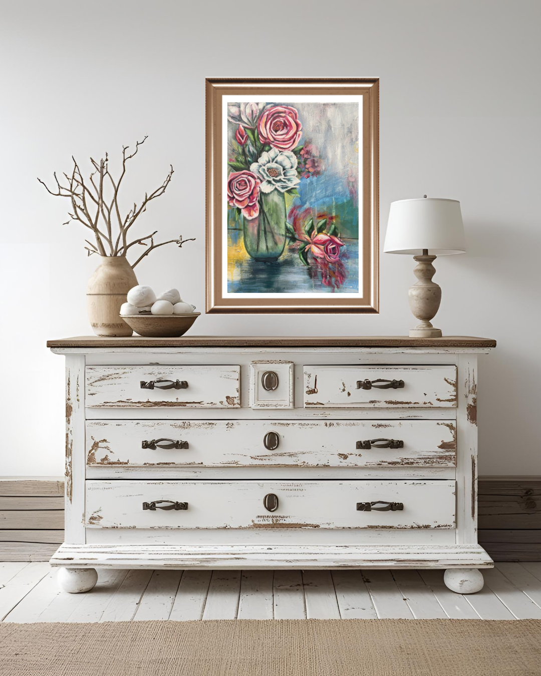 "Nothing Wasted" reveals the profound truth that every fragment of life holds value. The single rose, resting and reflecting on the glass table symbolizes the beauty that can be found even in the seemingly unimportant. Surrounded by blooming pink and white roses held perfectly in the clear green vase, this piece affirms that in the masterpiece of life every part has beauty and value.