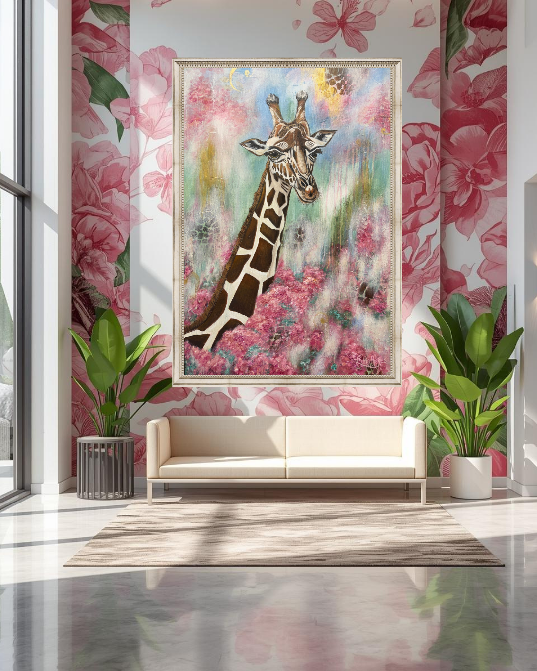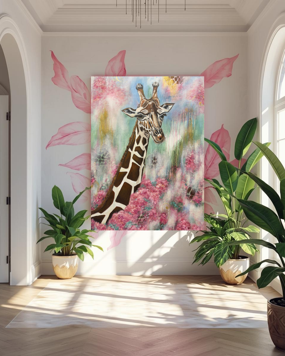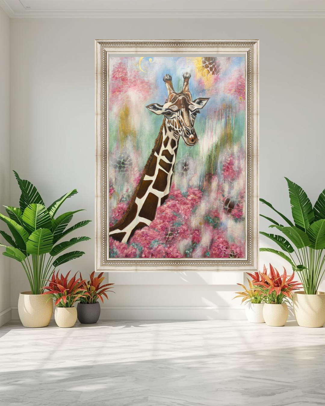 "Rise Up" captures the moment we are called to rise above the noise and distractions of this world to see from a divine perspective... to 'Look for the Gold' in every situation. The giraffe, known for its unique ability to see far across the horizon, symbolizes the foresight and wisdom that come from a close connection with our Creator. As it emerges from a bed of flourishing flowers, it reminds us that while we are planted in this world, we are called to live with our eyes fixed on higher things. This piece is an invitation to rise above your circumstances and embrace the expansive view of hope and purpose that God has for you.