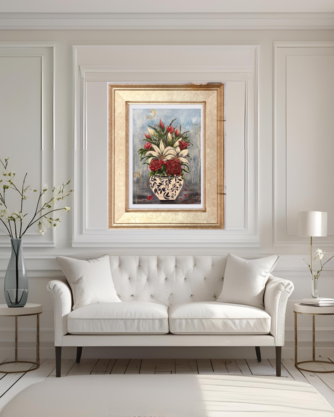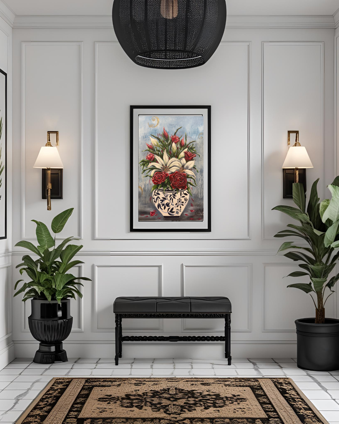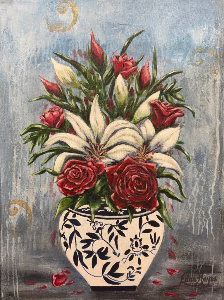 "Winter Hope' is a visual prayer for renewal, hope, resilience and faith. The vibrant red roses represent heartfelt love and courage, while the white flowers symbolize clarity and divine purity, all held within a calming blue and white vessel... a reminder that even in the coldest, darkest times, hope and faith can blossom bright and eternal.